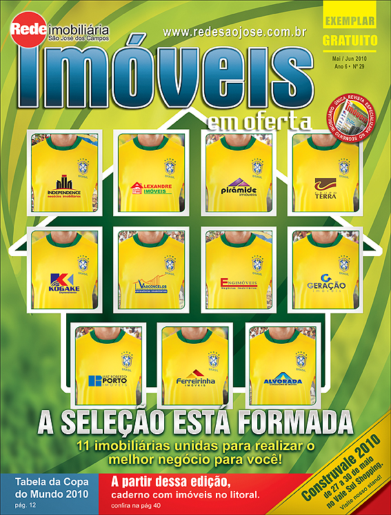M.Betti cria capa para Revista de Imóveis de São José dos Campos (SP). O tema foi a Copa do Mundo 2010, a Rede é formada pelas 11 maiores e mais tradicionais imobiliárias do Vale do Paraíba. Desde 2005 a M.Betti atende a Rede de Imóveis de São José dos Campos. Hoje a revista está consolidada no mercado e é o principal meio de comunicação da Rede.